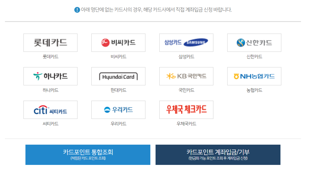 카드 포인트 통합조회 가능 카드사는 "롯데, 비씨, 삼성, 신한, 하나, 현대, 국민, 농협, 씨티, 우리, 우체국카드"라면 카드포인트 통합조회가 가능합니다.