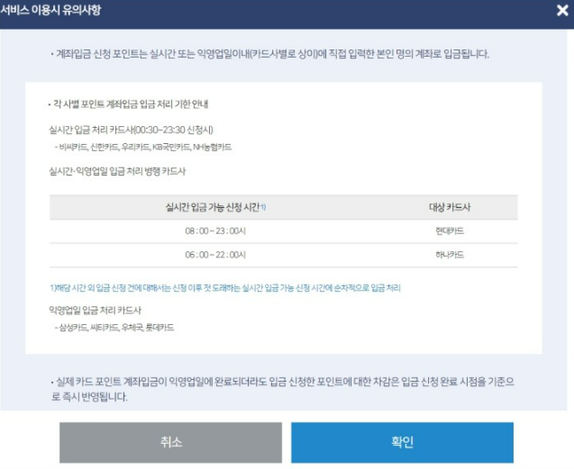 00시 30분부터 23시 30분 신청시 실시간 입금이 가능한 곳은 "비씨카드, 신한카드, 우리카드, KB국민카드, NH농협카드"가 있으며, 실시간 입금 가능 신청시간이 정해진 곳은 "현대, 하나카드" 입니다.