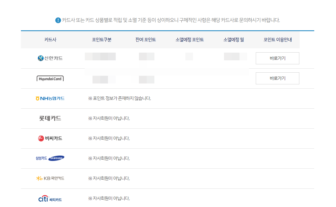 또한 포인트 소멸과 관련해서 여러 카드 포인트들이 유효기간이 정해져있으니 만약 오래된 카드를 조회했을때 포인트가 없다면 포인트가 소멸된 상황일 수도 있으니 유의해야 할 것 같습니다.