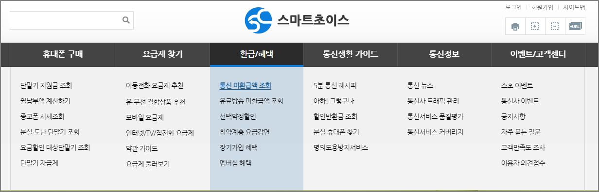 먼저 검색포탈에서 통신사 미환급액 조회를 검색하면, "스마트초이스"라는 사이트를 확인하실 수 있습니다. 여기를 클릭해서 들어가보도록 할게요.